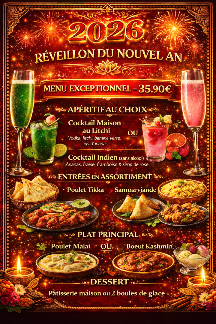 Nous vous proposons un grand choix d'entrées, plat principal, dessert et menus. Vous trouverez ici un extrait de notre carte gastronomique d'une grande richesse Indiennes.